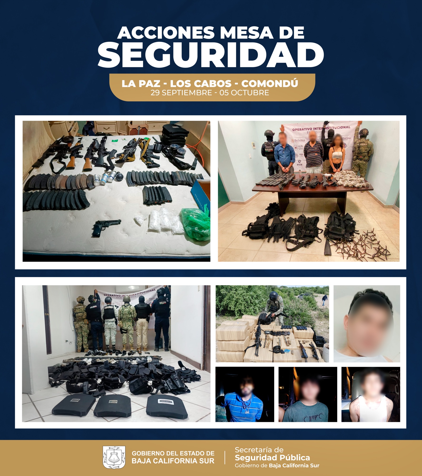 Derivado de las acciones conjuntas que se realizan para fortalecer la paz y la seguridad en Baja California Sur, la Mesa Estatal de Seguridad informa los resultados obtenidos del 29 de septiembre al 5 de octubre en los municipios de La Paz, Los Cabos y Comondú, en los que resalta la detención de objetivos prioritarios para las autoridades de la entidad.