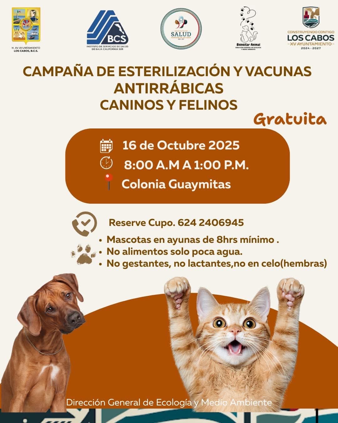 El XV Ayuntamiento de Los Cabos, a través de la Dirección General de Ecología y Medio Ambiente y en coordinación con la Secretaría de Salud, el Comité de Bienestar Animal y Salud Municipal invita a las personas propietarias de animales de compañía a participar en la jornada gratuita de esterilización canina y felina, que se llevará a cabo este jueves 16 de octubre, en la colonia Guaymitas, en San José del Cabo, en un horario de 08:00 a 13:00 horas.
