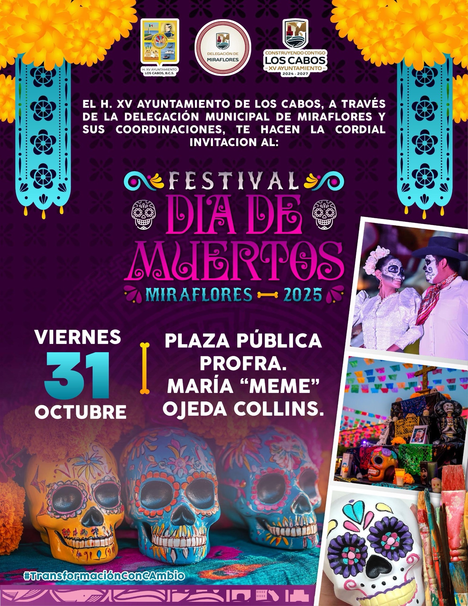 El XV Ayuntamiento de Los Cabos, a través de la Delegación Municipal de Miraflores y sus distintas coordinaciones, invita a la ciudadanía a participar en el Festival Día de Muertos Miraflores 2025, que se llevará a cabo este viernes 31 de octubre en la plaza pública Profesora María “Meme” Ojeda Collins, bajo el lema “En el altar del corazón, nunca muere la tradición”.