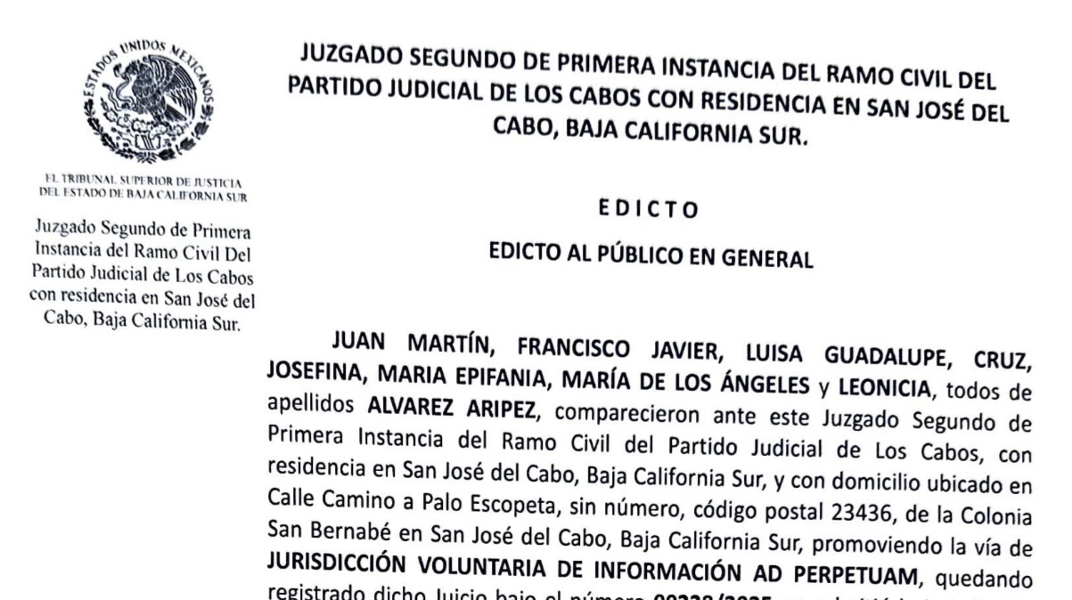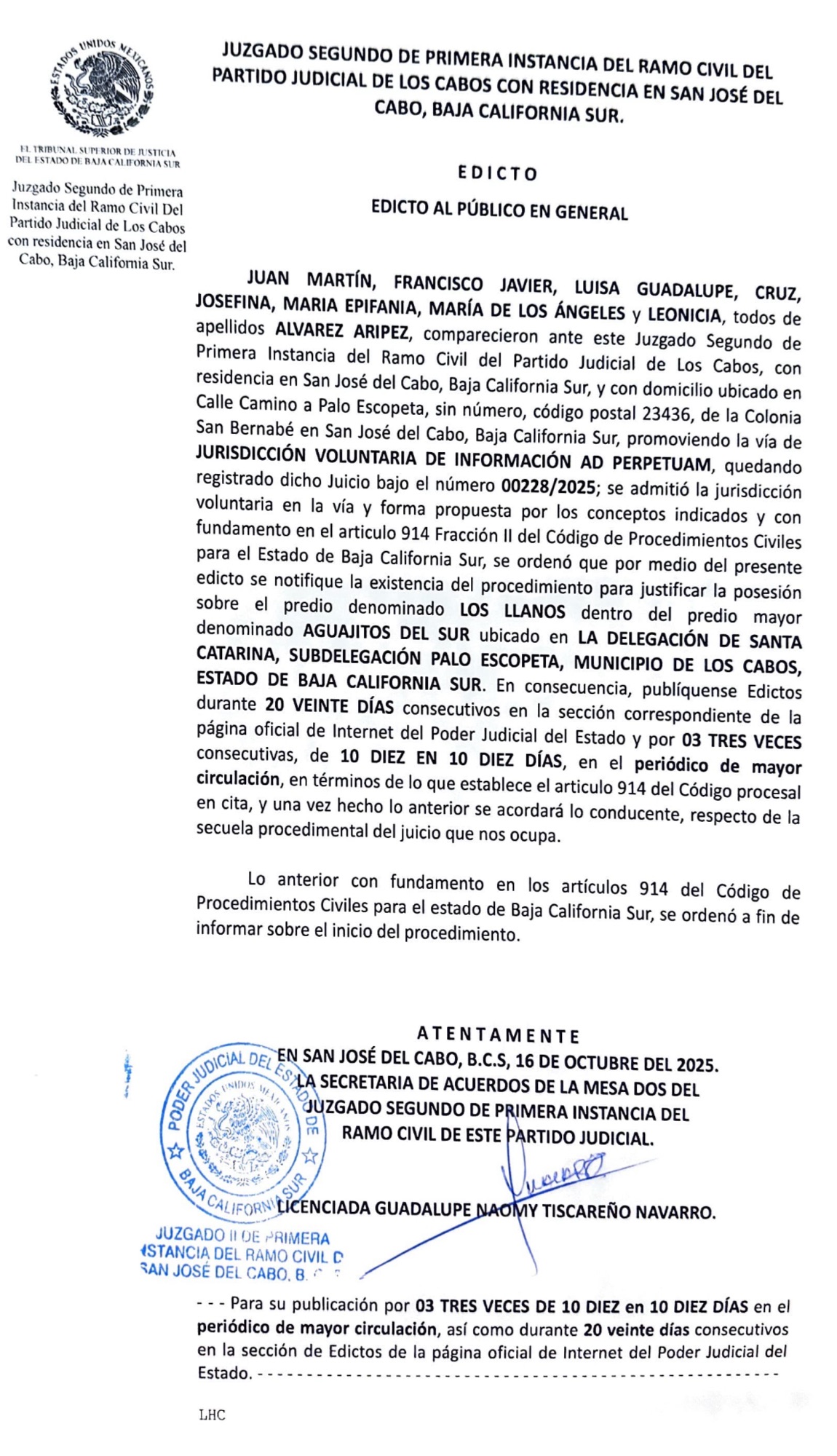 San José del Cabo, B.C.S.– El Poder Judicial de Baja California Sur dio a conocer un edicto correspondiente al expediente 00228/2025, por medio del cual varios ciudadanos de apellidos Álvarez Aripez iniciaron un procedimiento de Información Ad Perpetuam para formalizar la posesión del predio conocido como “Los Llanos” en la Delegación de Santa Catarina.