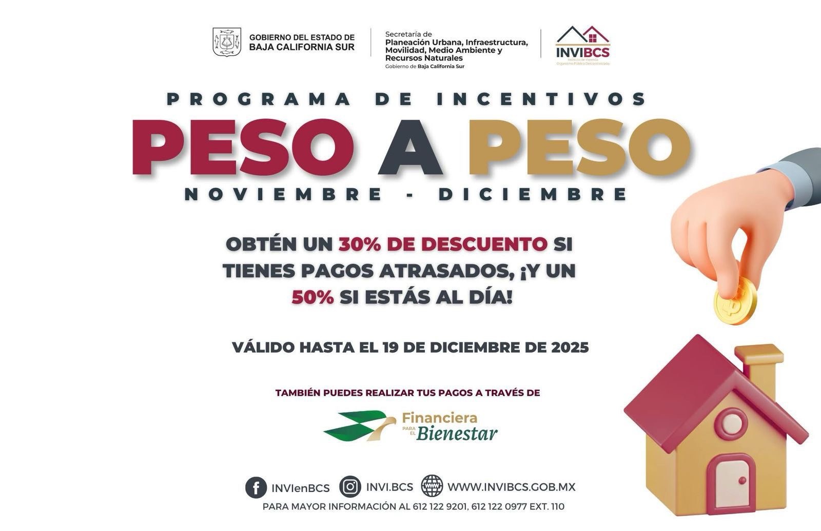El Gobierno del Estado, a través del Instituto de Vivienda de Baja California Sur (INVI), informó que el programa de incentivos Peso a Peso permanecerá disponible hasta el viernes 19 de diciembre, ofreciendo a las personas con crédito activo la posibilidad de obtener descuentos relevantes y mejorar su economía familiar.